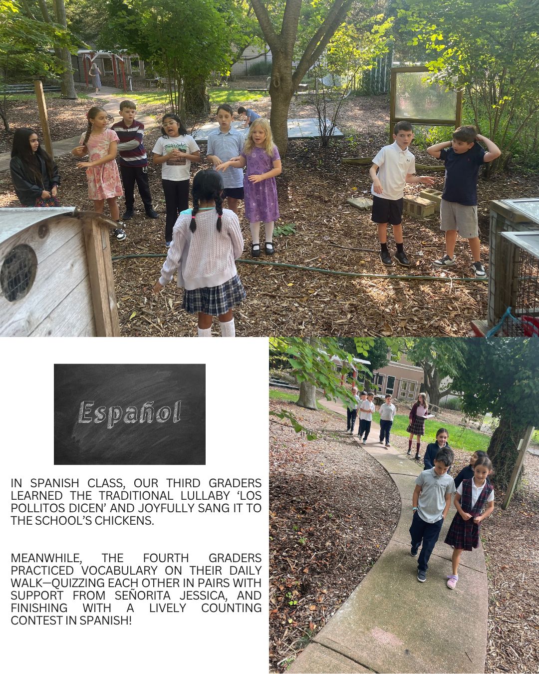 -In Spanish, third graders learned the lullaby “Los pollitos dicen” and sang it to our school’s chickens, while fourth graders practiced vocabulary on their daily walk and wrapped up with a lively counting contest.